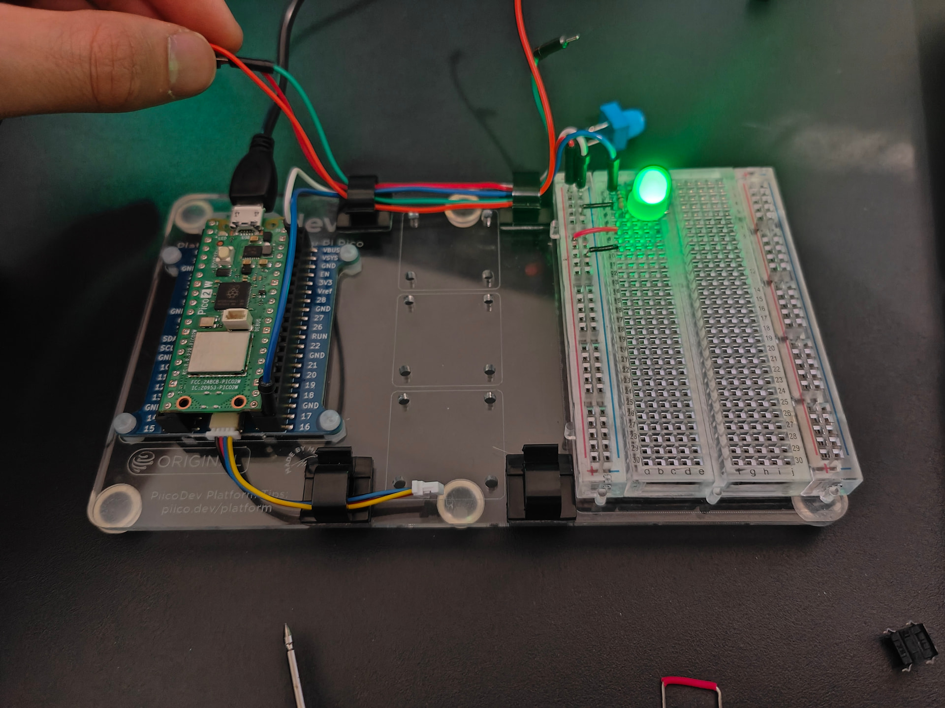 Connecting USB power does nothing as normal. Clicking the button then turns on LED and does not turn off unless USB power is disconnected. Disconnecting pin 15, 26, and 3v3 does nothing. Disconnecting 16 and ground turns off the LED but turns back on when reconnected.