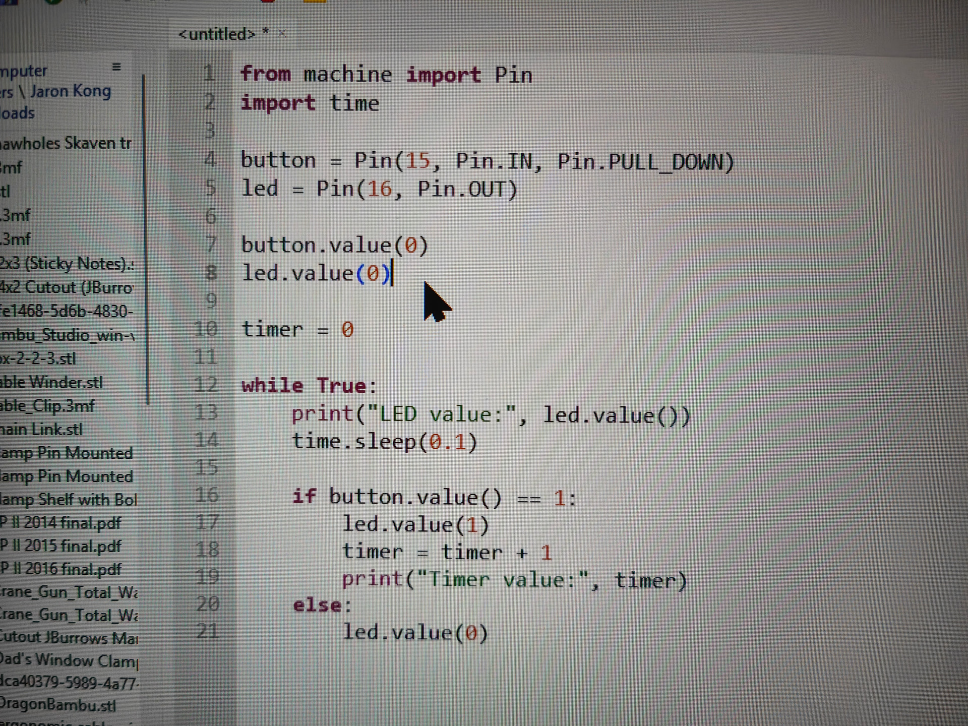 Disconnecting all but pin 16, ground. I believe for some reason the circuit thinks that button.value is constantly 1 even though literally nothing is connected to pin 15. In this state, when I use the multimeter to measure the voltage between ground and 15, the LED sometimes turns off (no voltage reading), sometimes turns on (-2V reading this time). If the LED is turned off this way, connecting the MM pins to 3v3 and 15 can both turn the LED on and off. I no longer know what’s happening.