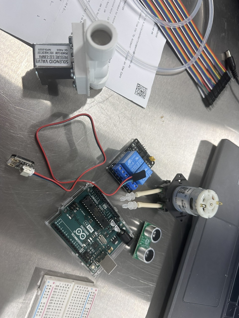 If the measured distance is less than 0.3m, the Arduino will send an output signal to open the solenoid valve and activate the pump, which will draw water from the tank and spray it through a nozzle.