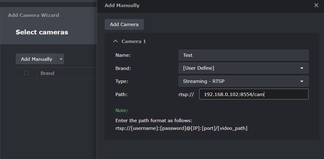 7. In Synology SS go to IP Camera > Add > Add Camera and add your camera as per the snip below.