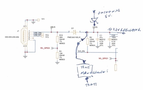 Apologies was in a rush so couldn’t spend time drawing the whole charge circuit for VBAT in my drawings above. Piecing together my hastily drawn images, the circuit looks like this.