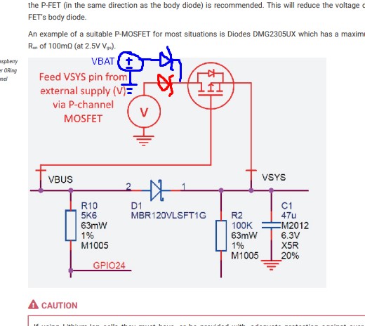 Now, whenever VBUS or the external supply are present, the battery gets charged. When they’re not, VBAT can safely supply VSYS without that circular dependency.