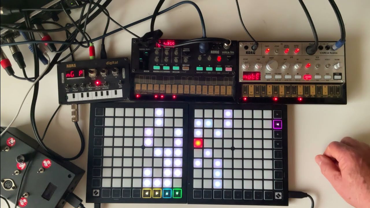 The Teensy is running a version of Langton’s Ant to determine the colour of the squares on the Launchpads. As the sequence increments (see blue pad for sequence position) the NTS-1 is playing notes based on the Ants y position (Red pad). The Volcas are playing notes based on the white and black pads.