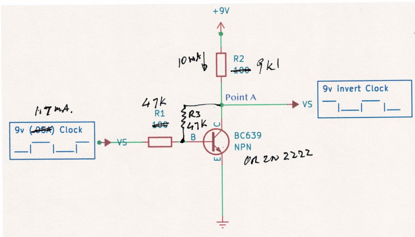 In the scenario when the clock is LOW the transistor closes so current chooses to flow HIGH out to my inverted clock at POINT A. If the clock IN is LOW the clock OUT is HIGH.